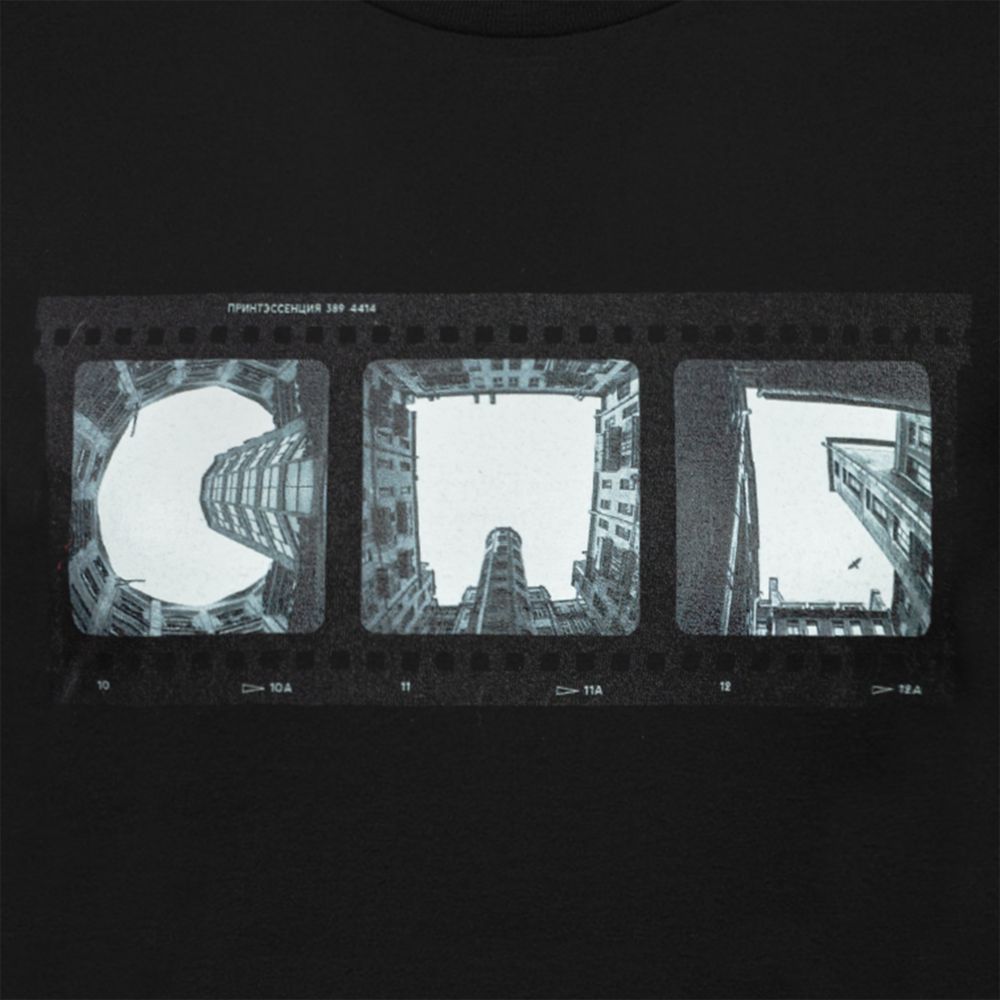 От фирменных питерских дворов-колодцев — а на принте очень четко обозначено место действия — кружится голова. От красоты, от неповторимости момента. Оттого, что здесь все возможно. Можно приподняться со дна «колодца» до самого неба. Стоит только поднять голову и открыться красоте.