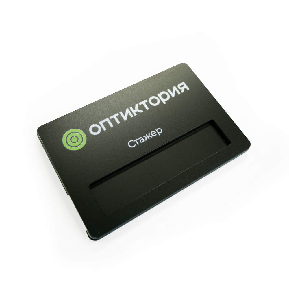 Материал - однослойный пластик белого или черного цвета, толщиной 0,8 – 1,6 мм. Это наиболее практичный для бейджа материал, стойкий к загрязнению, царапинам и воде.