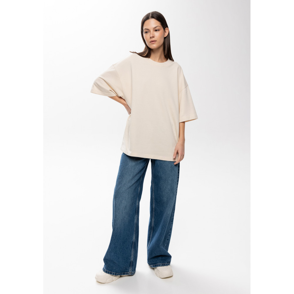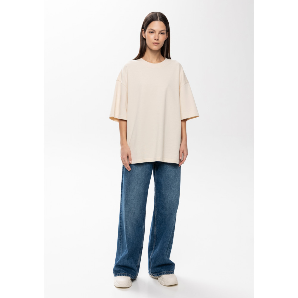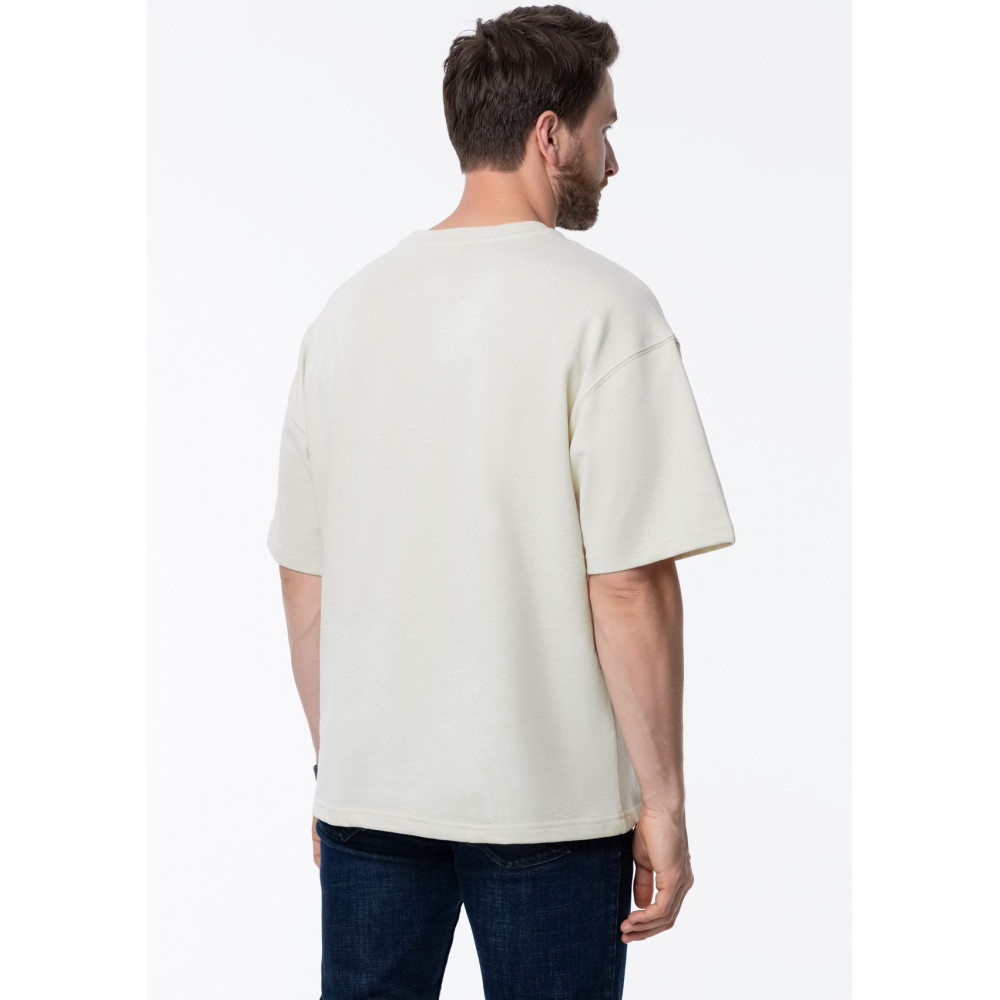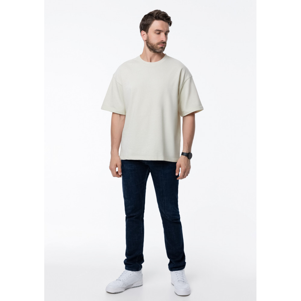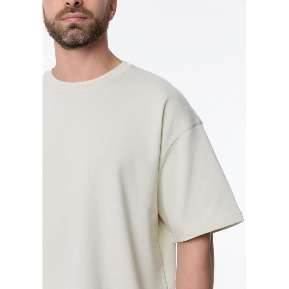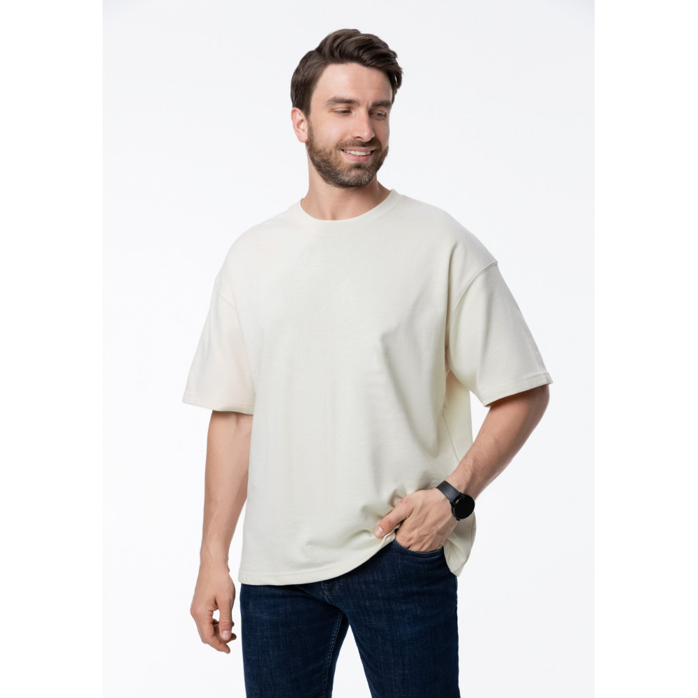 Футболка свободного кроя с округлым воротом и спущенной линией плеча. Шов горловины спинки усилен киперной лентой в тон основному цвету. Универсальная модель идеально впишется как в мужской, так и в женский гардероб.