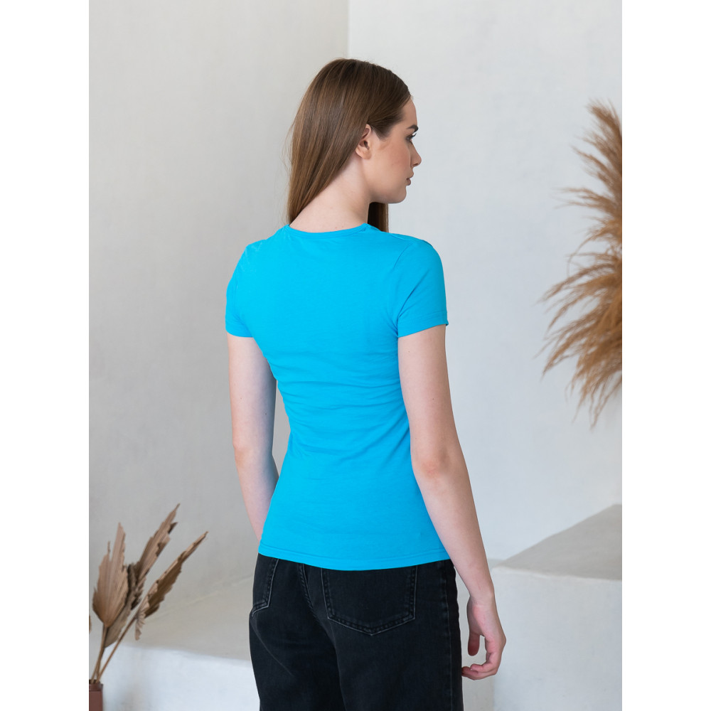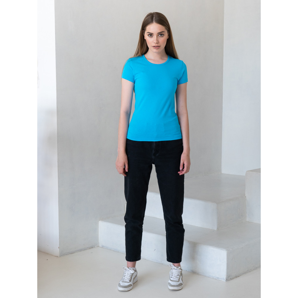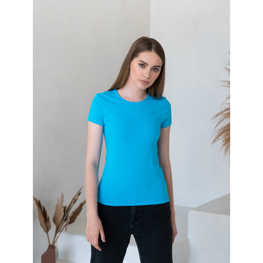 Женская футболка приталенного силуэта с округлым воротом и втачным рукавом.