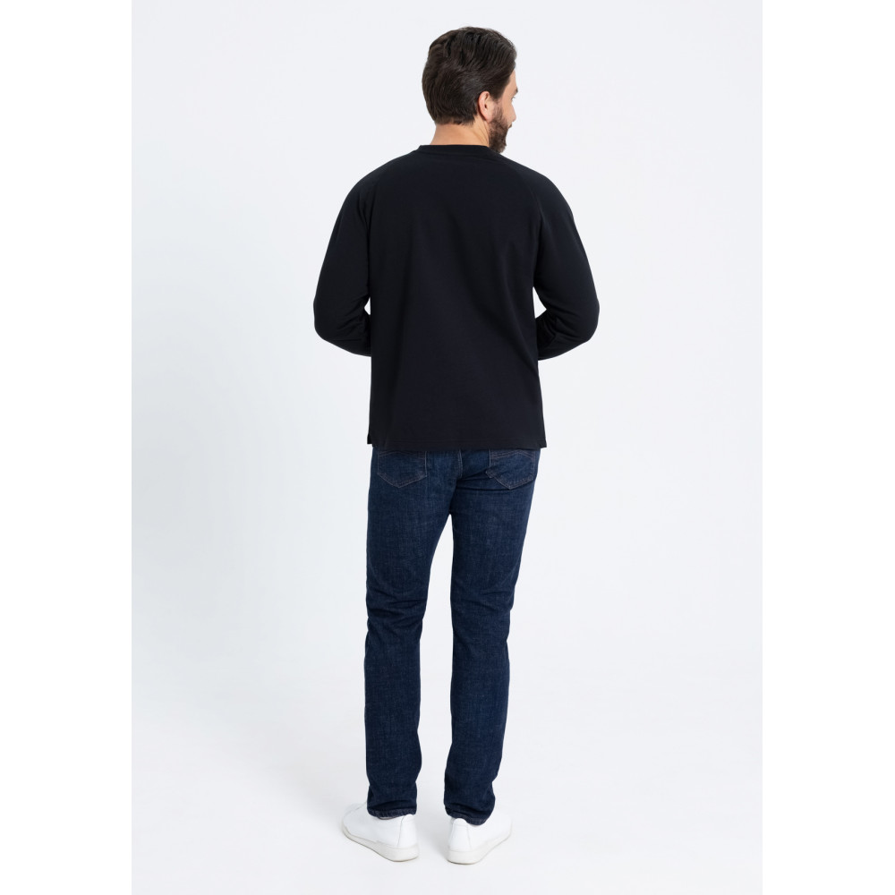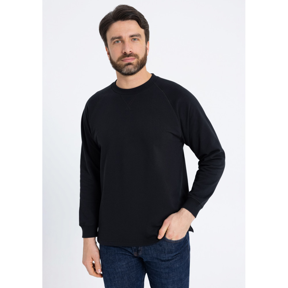 Свободный силуэт, округлый вырез, рукав-реглан и декоративные элементы, отсылающие к классическому крою. Ворот и манжет выполнены широкой эластичной резинкой.