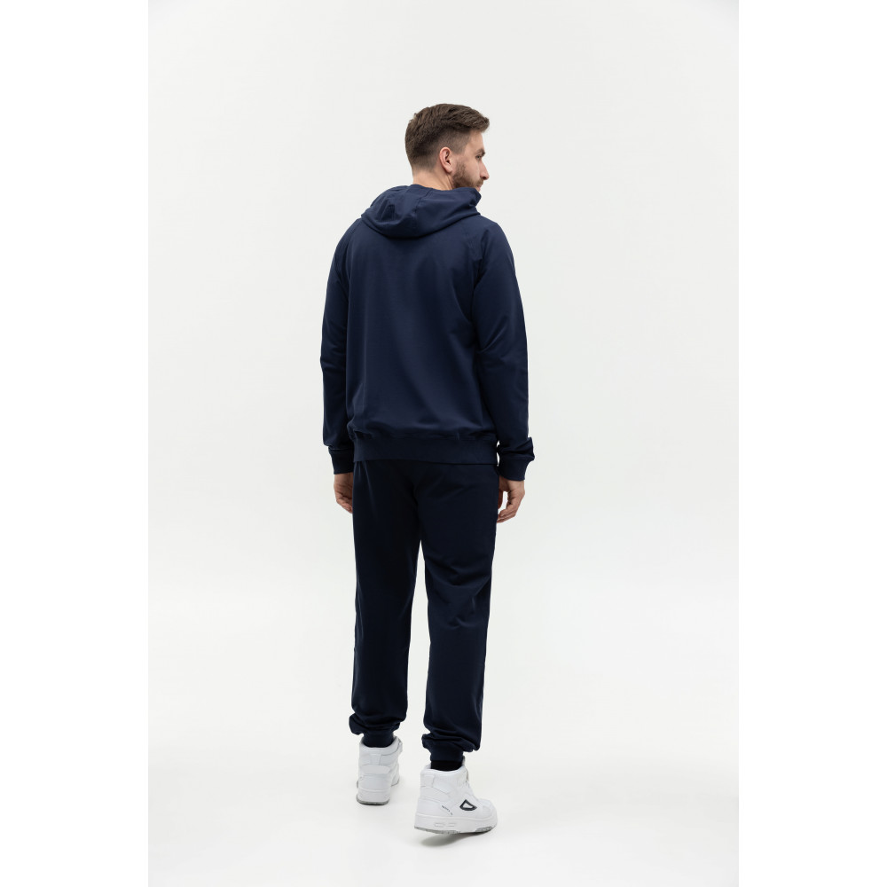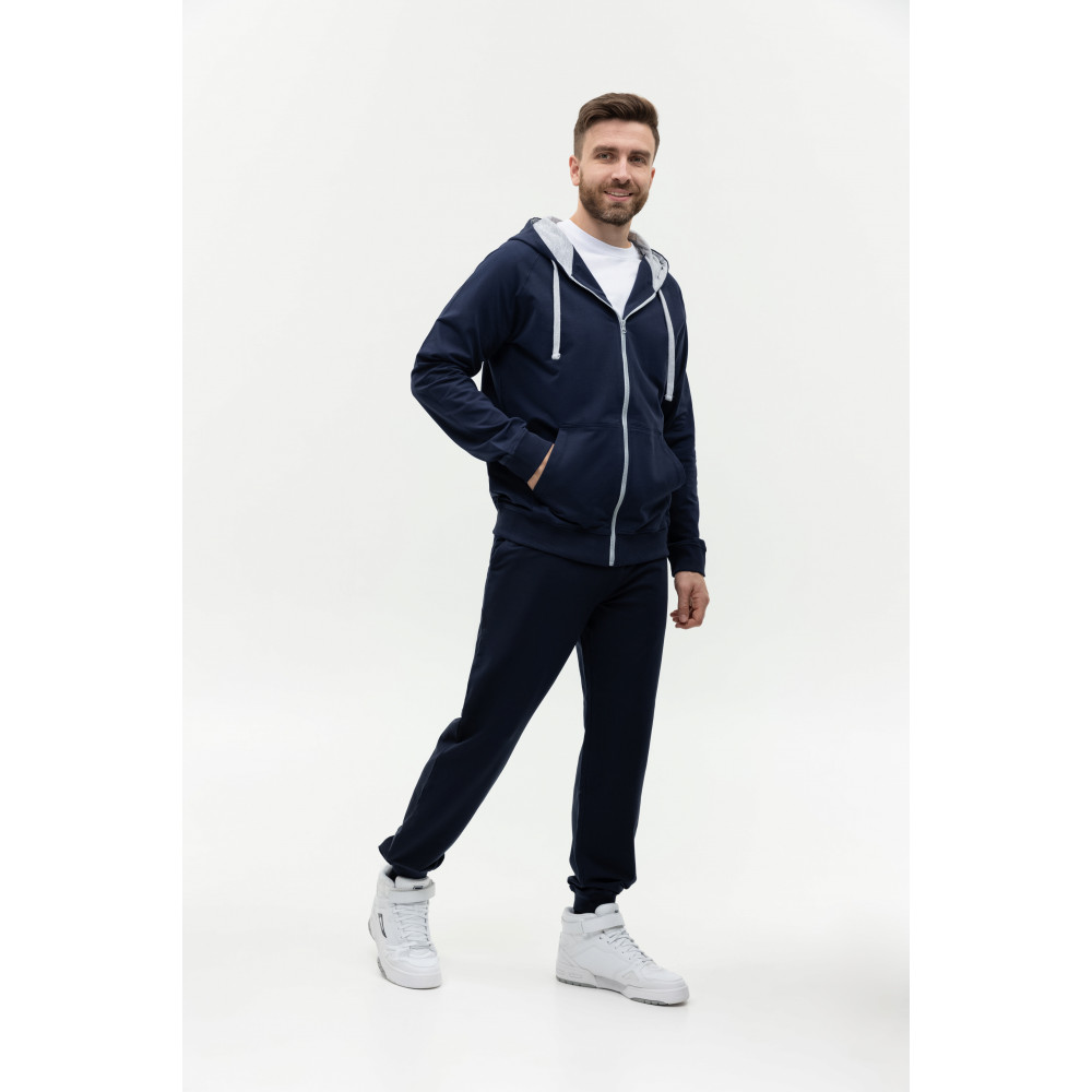Мужская толстовка прямого силуэта с капюшоном комфортной глубины, рукавом-реглан, глубоким накладным карманом и застежкой на молнию контрастного цвета. Капюшон дополнен шнурком для регулирования прилегания, манжет и низ изделия оформлены широкой эластичной резинкой.