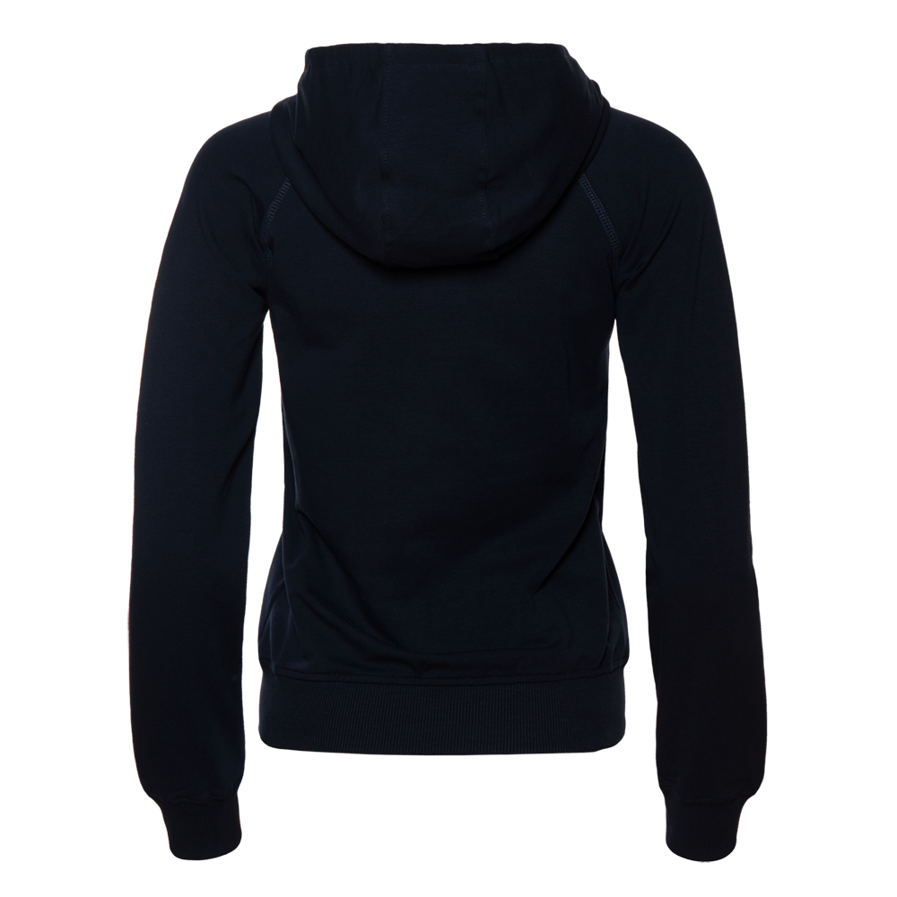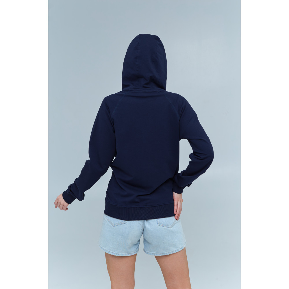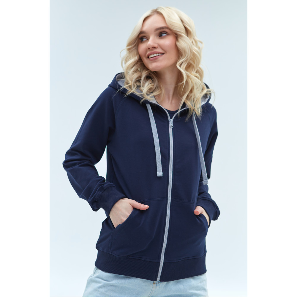 Женская олимпийка прямого силуэта с капюшоном комфортной глубины, рукавом-реглан, накладным карманом и застежкой на контрастную молнию. Капюшон дополнен шнурком для регулирования прилегания, манжет и низ изделия оформлены широкой эластичной резинкой.