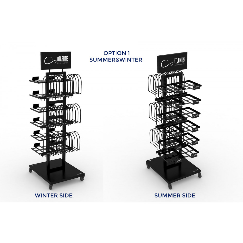 Стойка напольная укомплектованаполками для бейсболок (24 штуки) икрючками для шапок (36 штук). Вы сами сможете собрать как летний вариант стойки, состоящий только из бейсболок, так и зимний (только шапки), либо же разместить и то, и другое одновременно. Образцы продукции Atlantis: